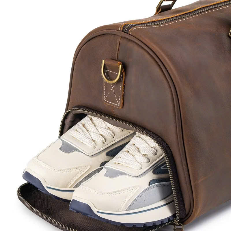 Ngăn Giày Riêng Biệt Phía Ngoài: Một ngăn khóa kéo ẩn bên ngoài được thiết kế đặc biệt để bạn tách biệt giày (hoặc đồ bẩn/đồ tập) khỏi khoang hành lý chính. Đây là yếu tố khiến chiếc túi này hoàn toàn phù hợp cho cả du lịch và đi tập gym – một sự kết hợp đa dụng, tiện lợi mà ít túi du lịch SVN Leather nào có được.